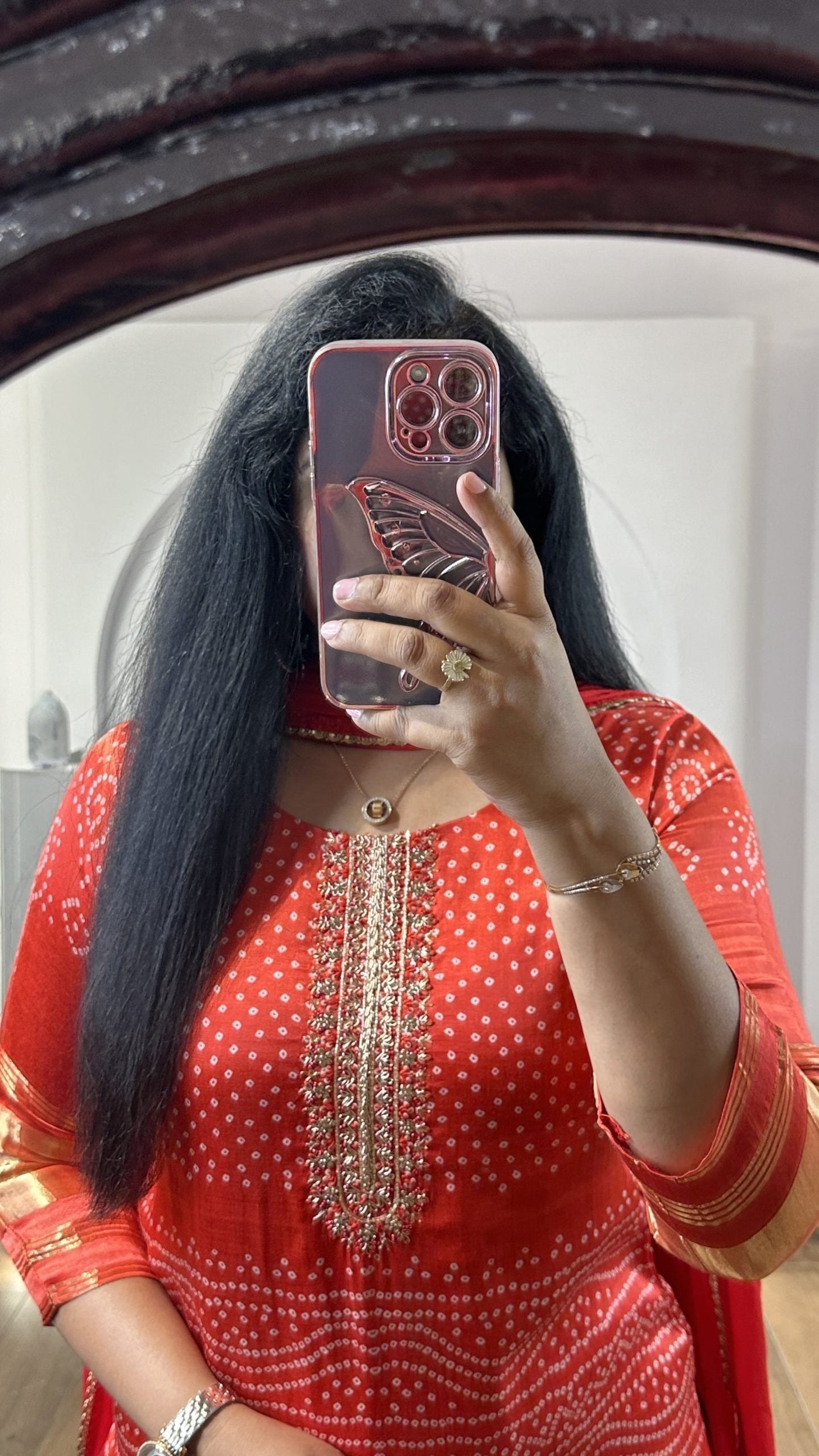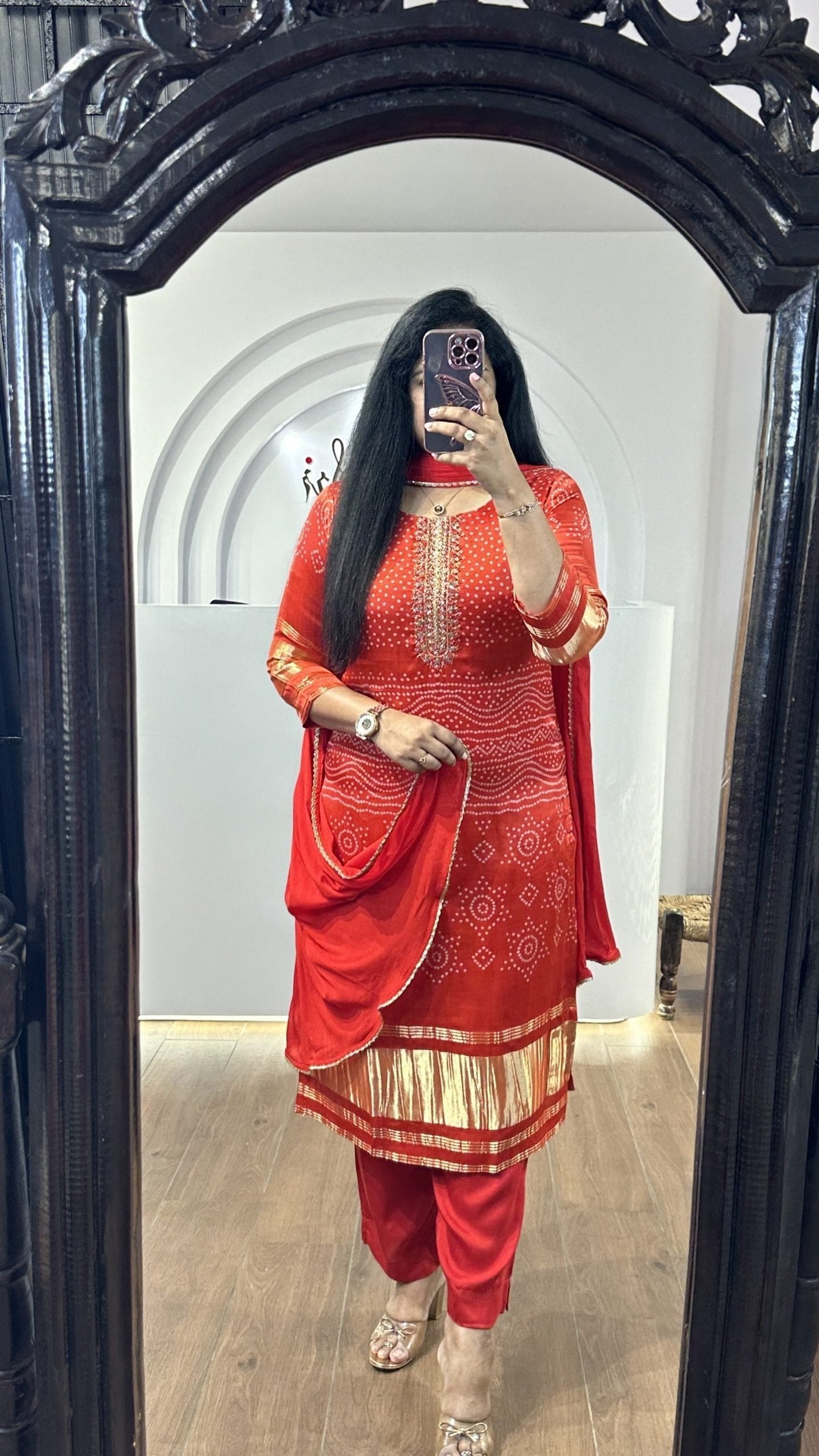 Red Bandhej Gajji Silk Kurti