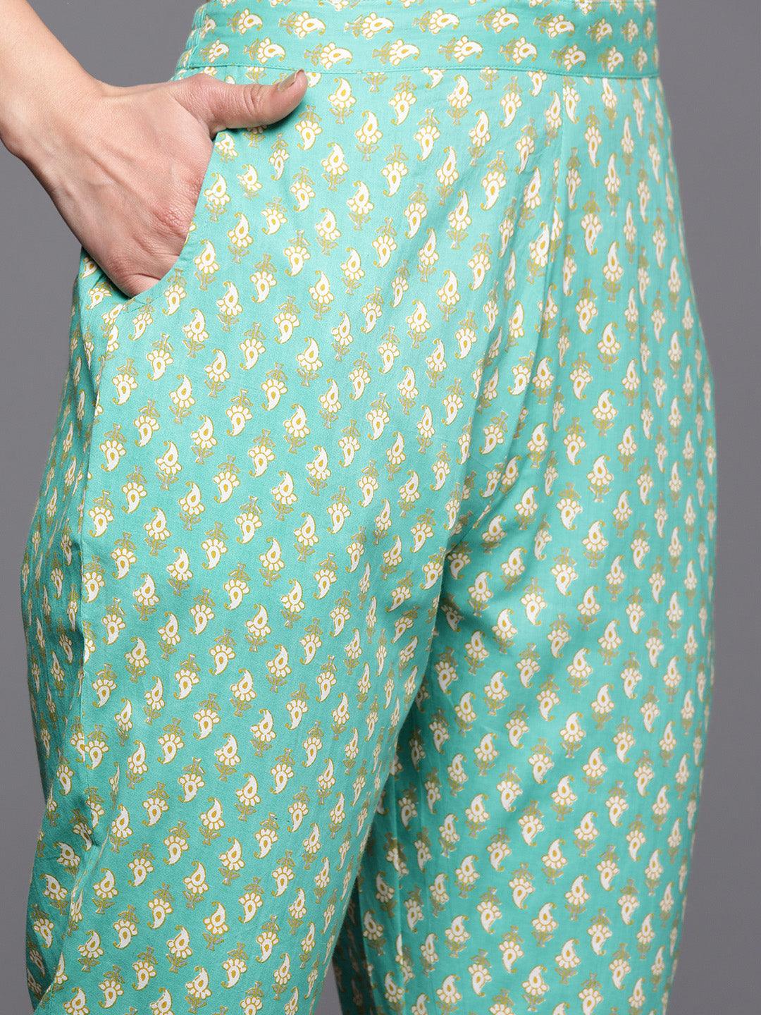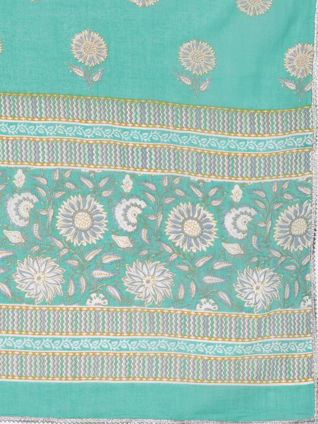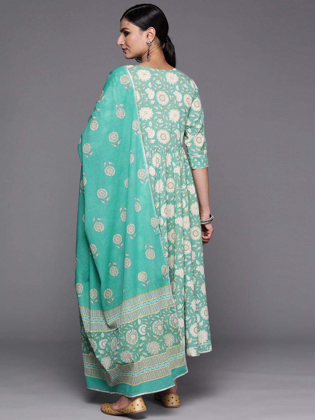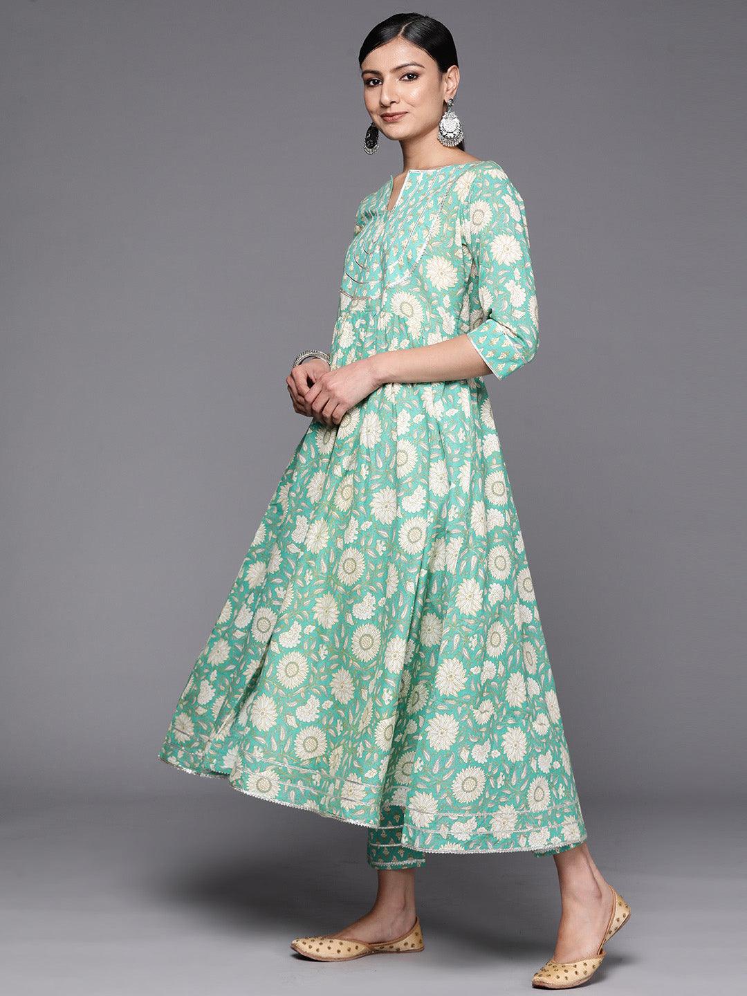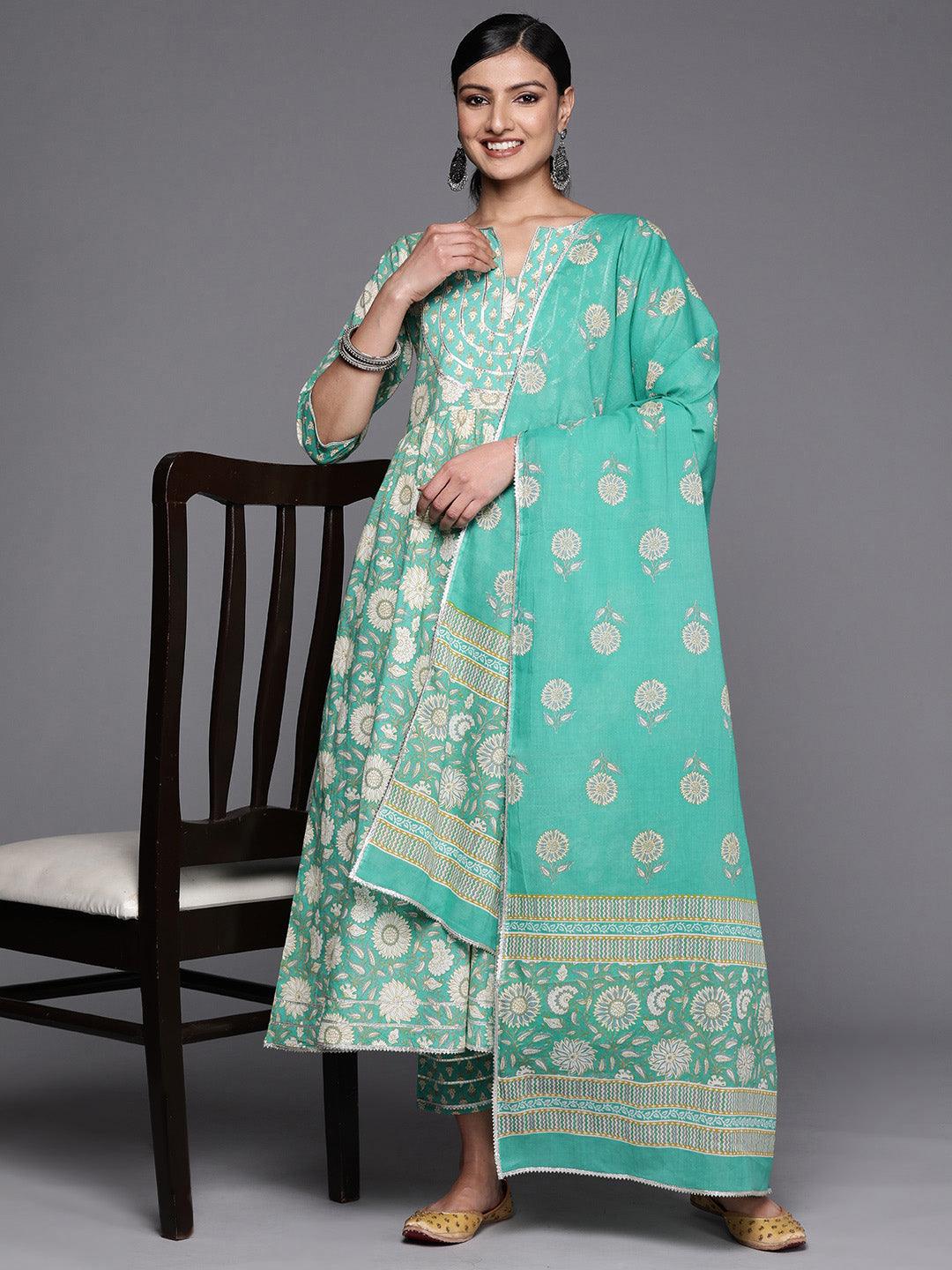 Our 3-piece green floral print cotton suit set features an Anarkali kurta with a notched neckline and three-quarter sleeves. Complemented with straight-fit pants with a partially elasticated waistband and roomy pockets, and a dupatta in a matching print. Adorned with delicate fabric-trim and Gota Patti accents, this comfortable style is perfect for light festivities.