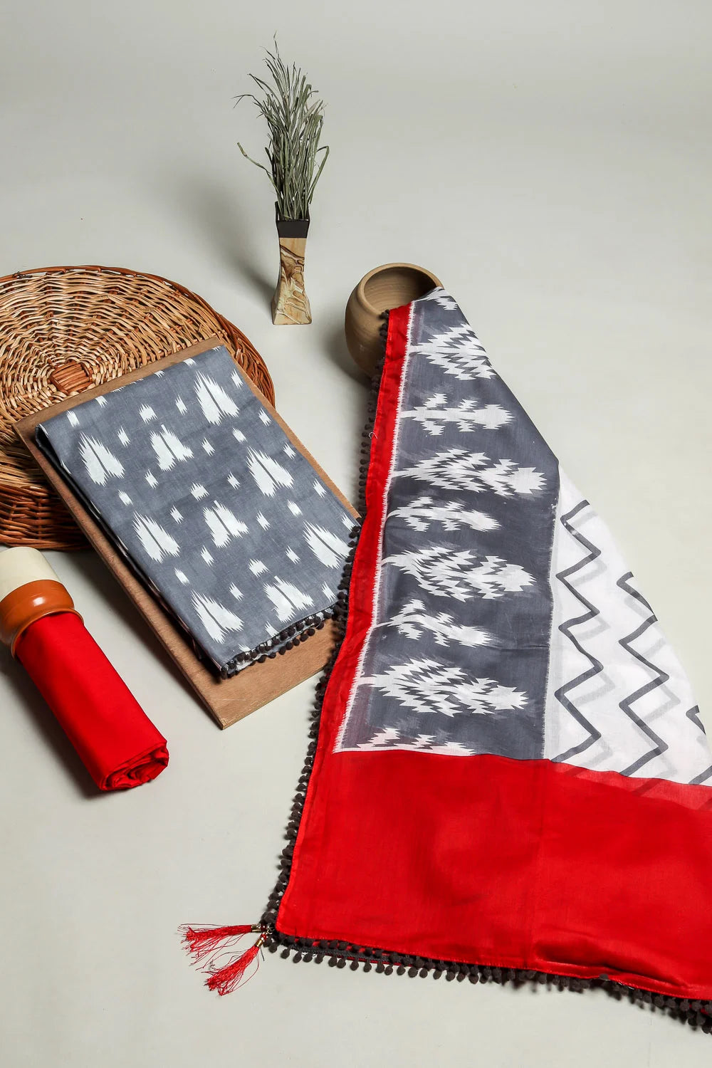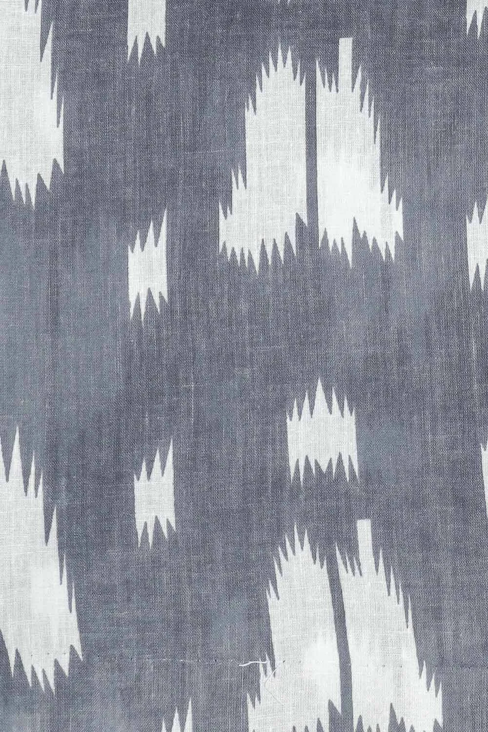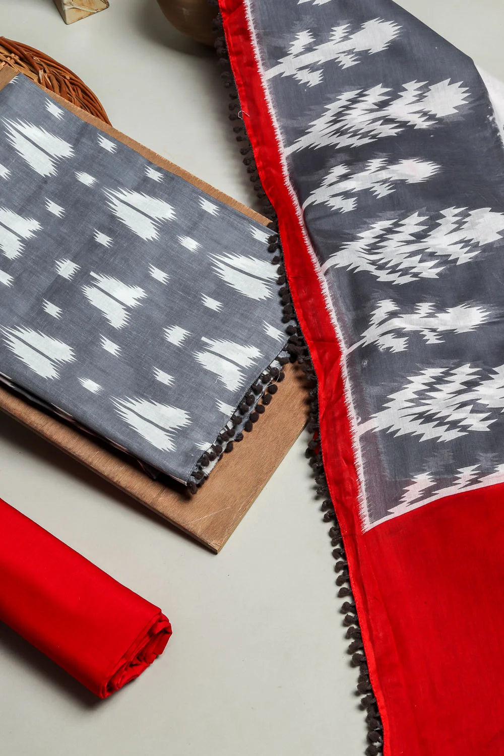 Grey Ikat Print 3Pcs. Suit Set In Cotton Fabric With Pom Pom